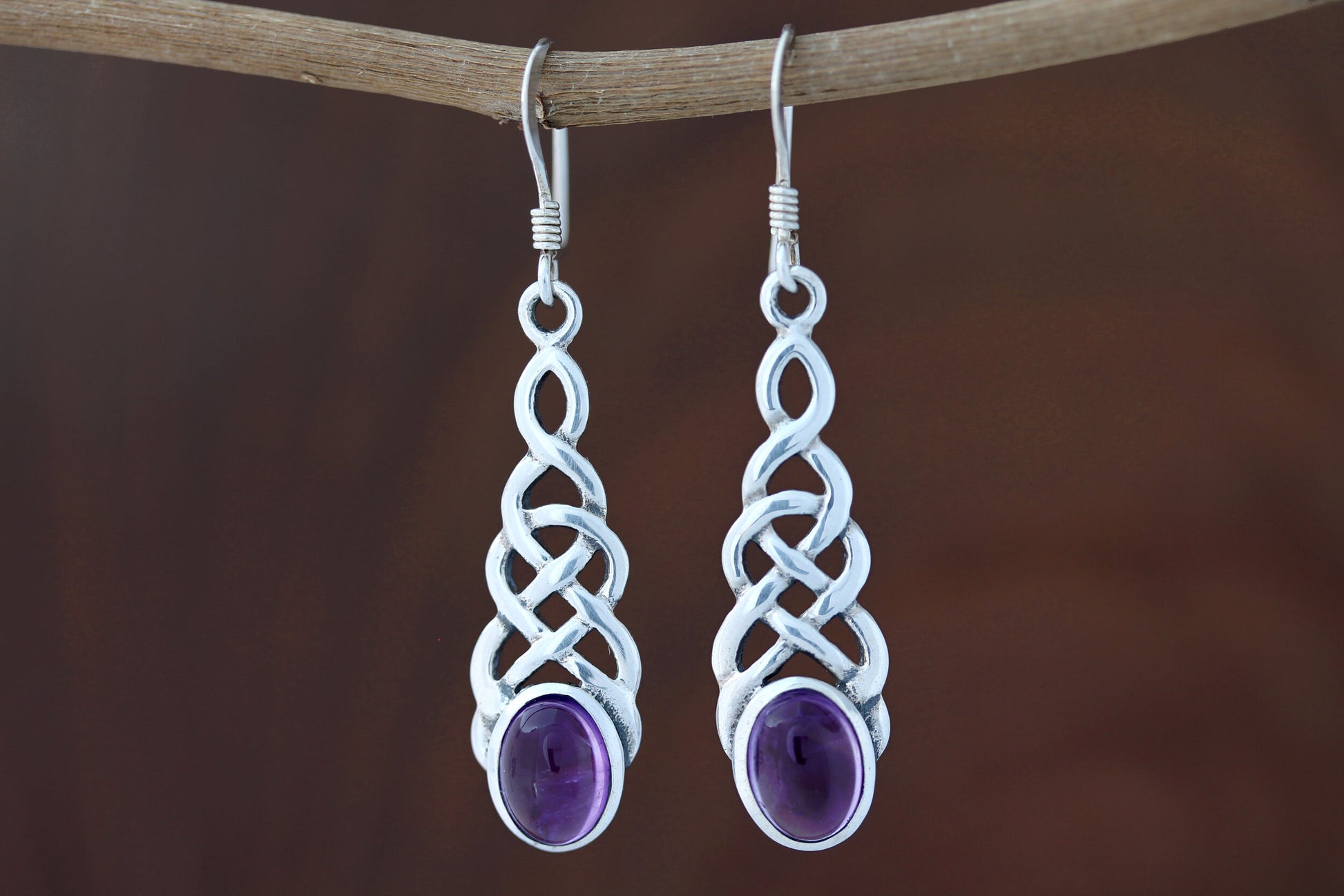Long looped Celtic earrings with Amethyst set in hallmarked 925 Sterling Silver.