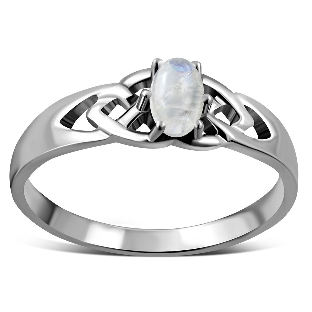 A Hallmarked 925 Sterling Silver Celtic knot ring featuring oval Moonstone.