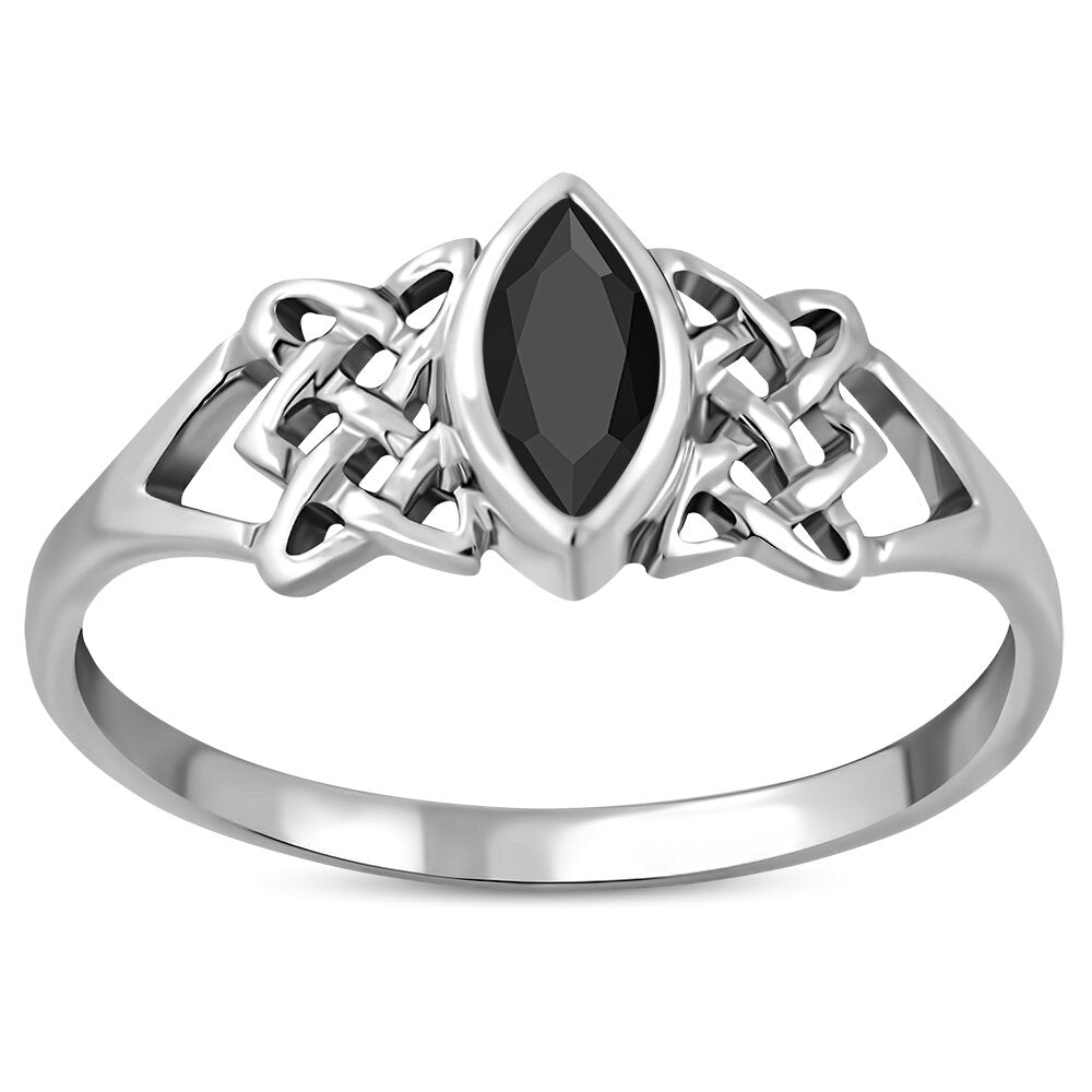 A Hallmarked 925 Sterling Silver Celtic knot ring featuring a marquee Black Onyx stone.