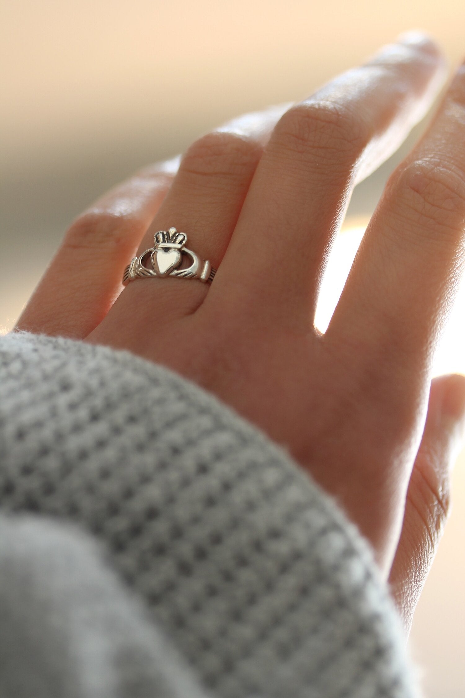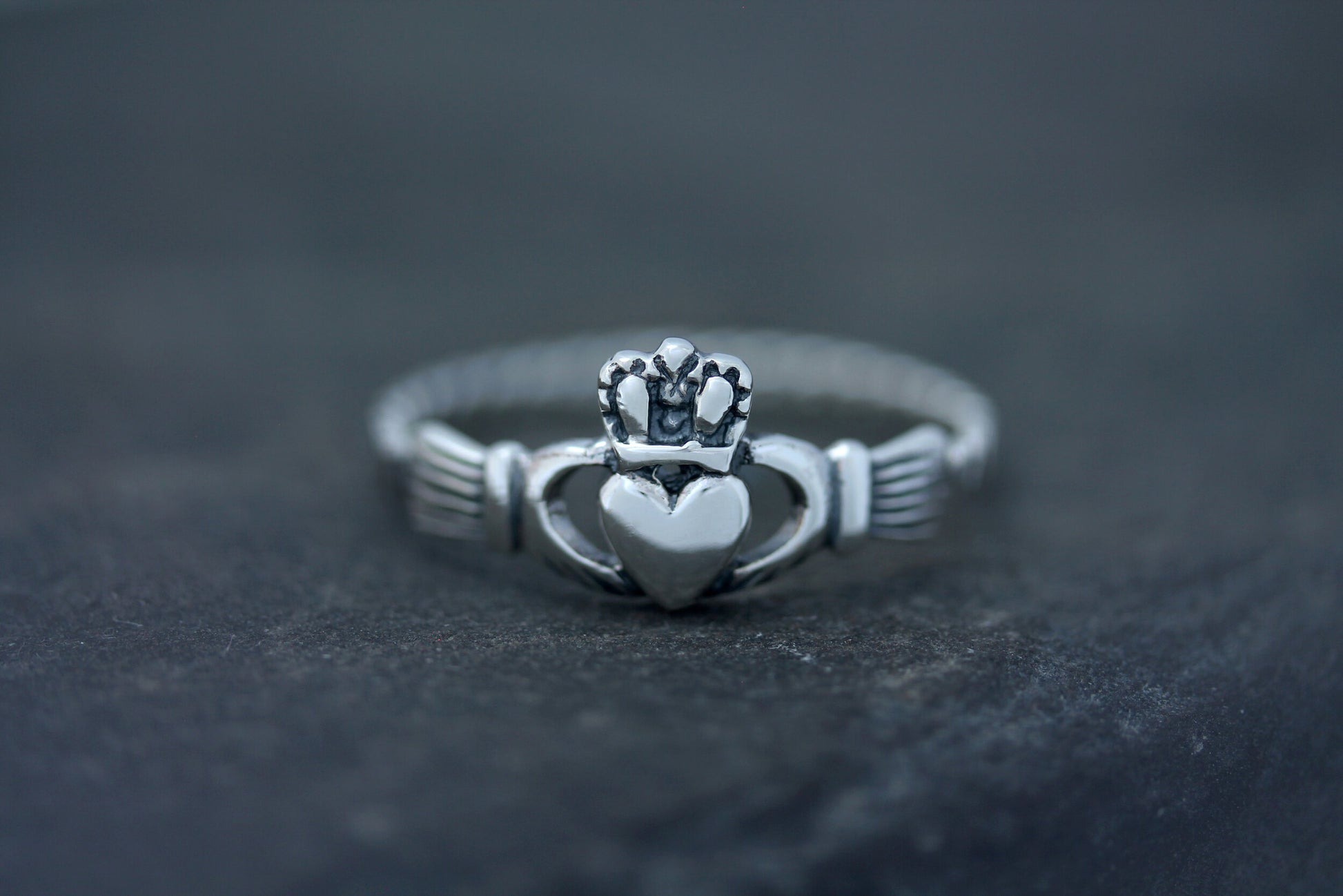 A traditional Irish relationship token, the Claddagh represents love (the heart), friendship (the hands), and loyalty (the crown). Wearing a Claddagh ring on your left hand with the tip of the heart towards your wrist shows your heart is taken.