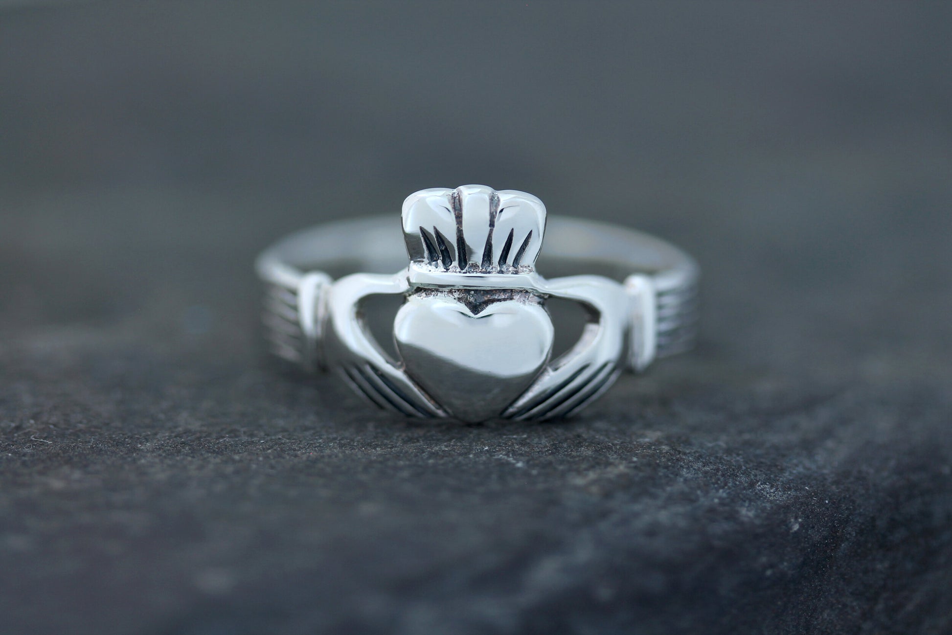 A traditional Irish relationship token, the Claddagh represents love (the heart), friendship (the hands), and loyalty (the crown). Wearing a Claddagh ring on your left hand with the tip of the heart towards your wrist shows your heart is taken.