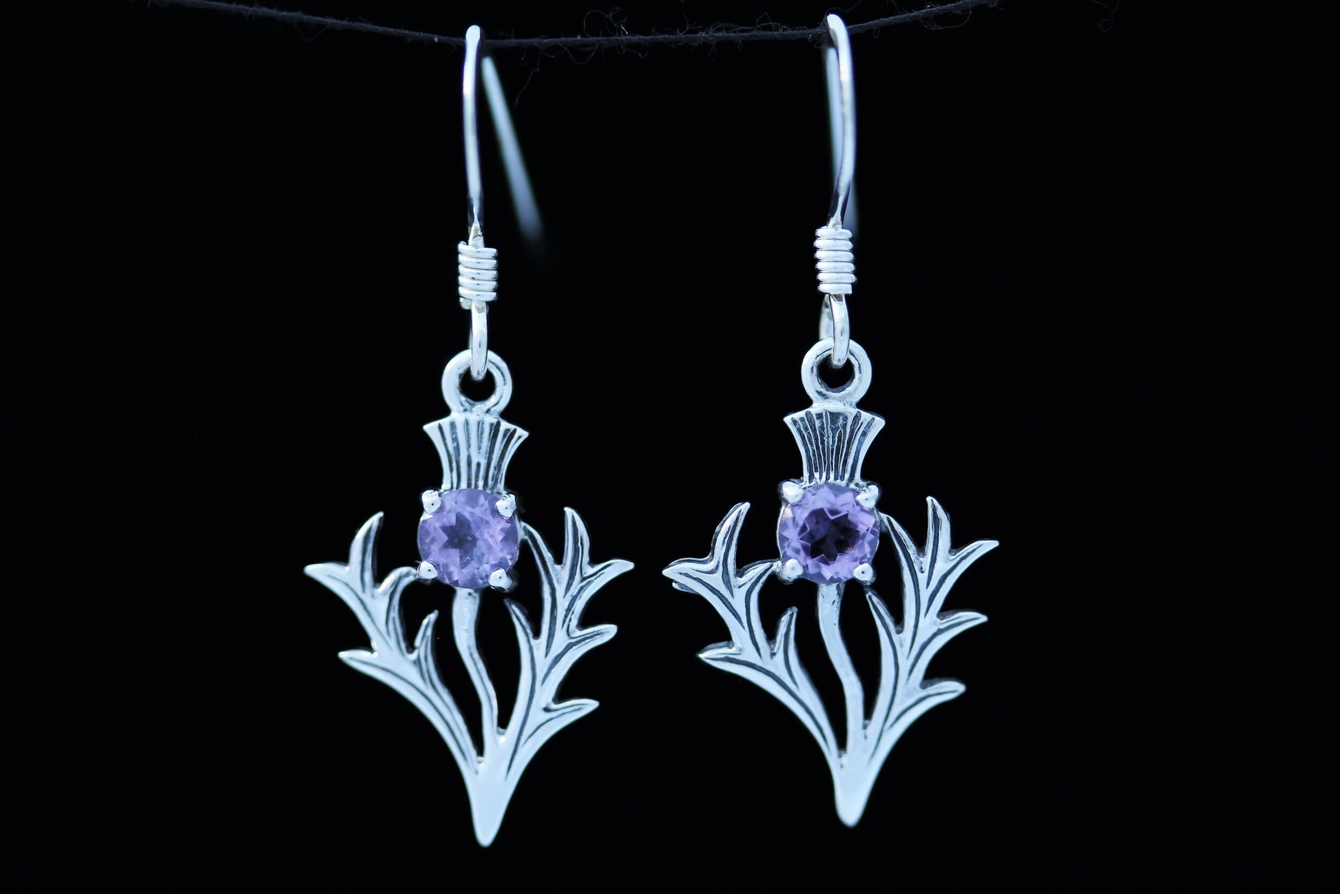 A Pair of Hallmarked 925 Sterling Silver Thistle earrings set with cut violet Amethyst.
