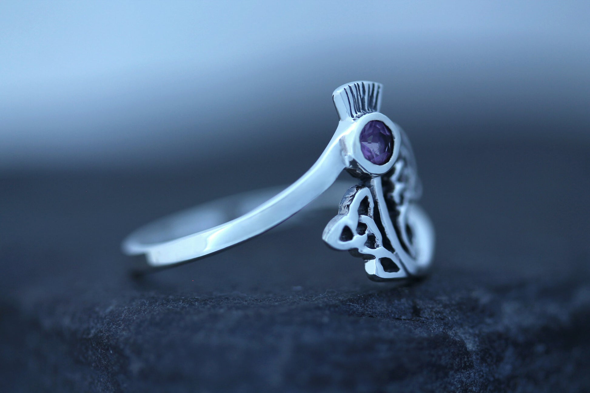 Scottish Thistle Ring with Celtic woven leaves with Cut Amethyst set in hallmarked 925 Sterling Silver.