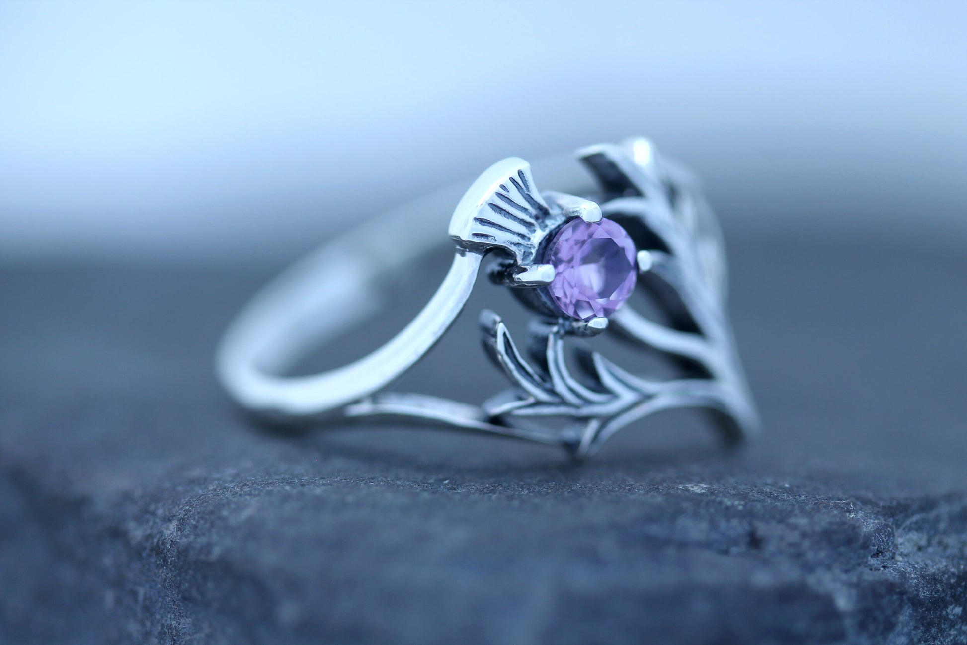 A Sterling Silver 925 Scottish Thistle ring in a gorgeous organic spiky leaf design featuring a cut amethyst stone.